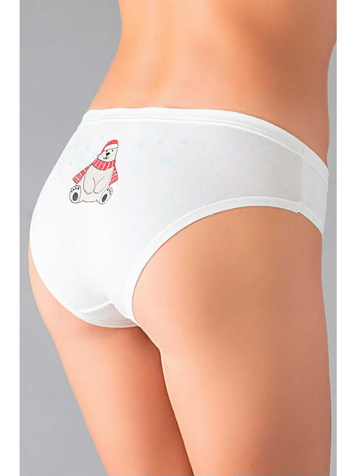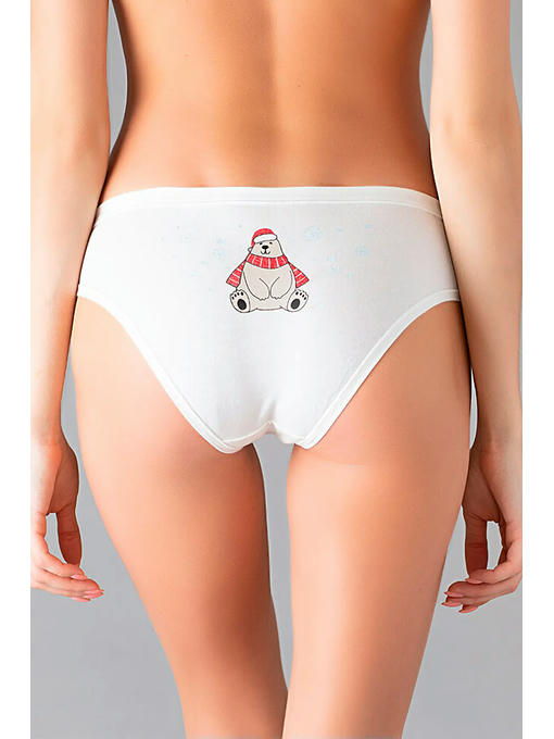 Хлопковые женские трусики-слипы из праздничной новогодней коллекции. Задняя часть модели декорирована ярким тематическим принтом “медведь и снежинки”, края отстрочены мягкой отделкой. Приятный к телу хлопок позволяет коже дышать, отлично впитывает влагу и идеально подходит даже для самой чувствительной кожи. Содержание эластана в составе обеспечивает превосходное облегание и увеличивает износостойкость