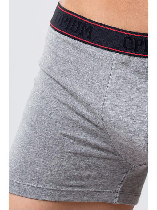 Мужские боксеры из мягкого хлопкового трикотажа. Благородное сочетание глубокого красного цвета ткани и насыщенного синего цвета резинки с выбитым логотипом Opium понравится любому мужчине. Есть более спокойный вариант в цвете «серый меланж», например, под светлые брюки. Двухслойный гульфик, дополнительная вставка для максимального комфорта и релакса