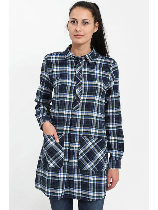 Женская туника свободного кроя в клетку. Горловина выполнена, как отложной воротник. Застежка спереди на пуговицы. Два кармана