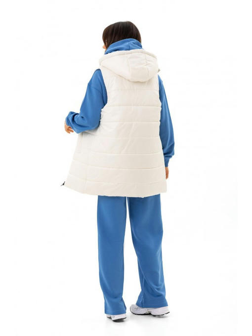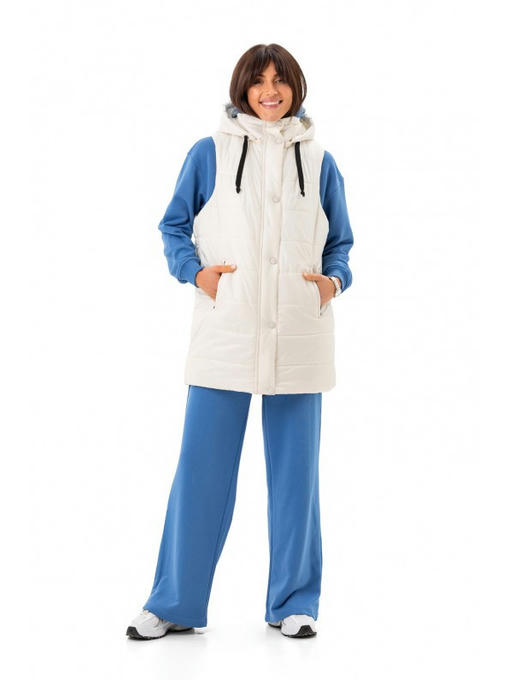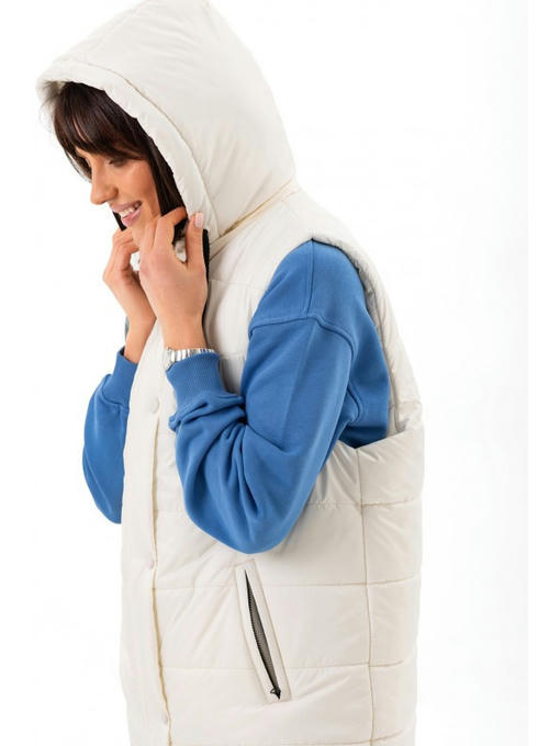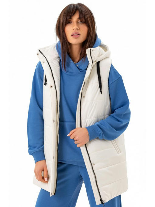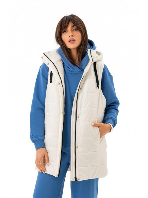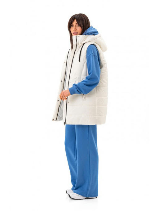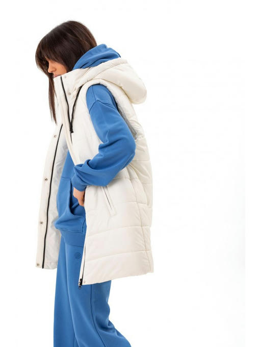 Воротник стоечкой. Глубокая пройма под рукава, благодаря которой ты не почувствуешь дискомфорта сжатия под руками. Есть прорезные карманы на молнии. Удобная женская жилетка имеет капюшон-скафандр на молнии, который можно отстегнуть. Капюшон декорирован кулиской с люверсами.