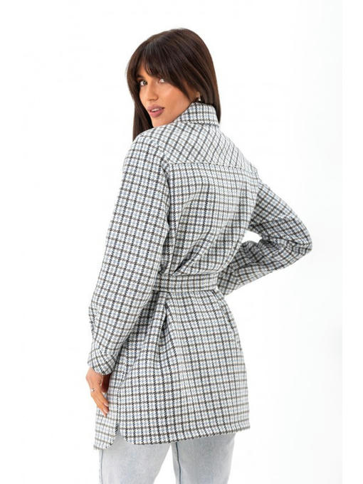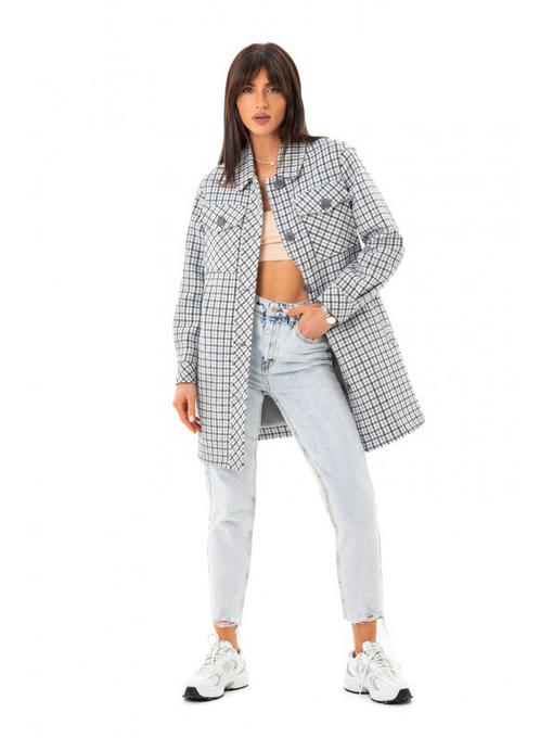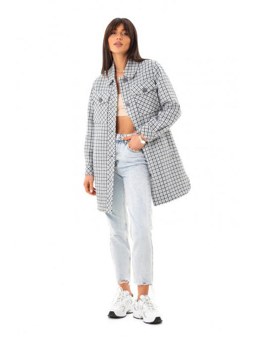 Удлиненное пальто-рубашка сделано из красивой ткани в разноцветную клетку. Модель средней длины с фигурным низом. Застежка-пуговицы расположены по центру. Воротник рубашечный. Рукава с манжетом также рубашечного типа. Есть 2 пары карманов: нагрудные и стандартные прорезные. Пальто оверсайз круто смотрится как под пояс, так и без него.