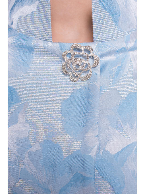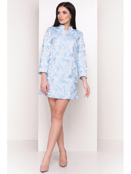 Стильный укороченный плащ прямого кроя. Изюминка модели – воротник стоечка и застежка с брошью. лаконичность кроя гармонично сочетается с роскошью жаккарда. Рукава с возможностью подворота. Застежка – потайная, по бокам – прорезные карманы.