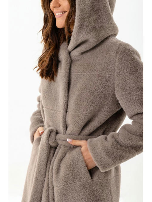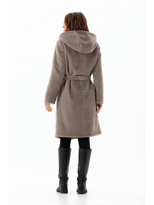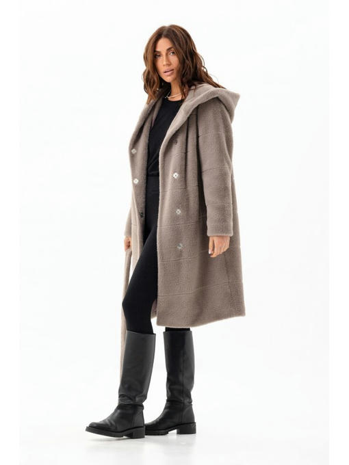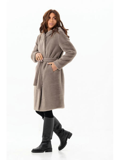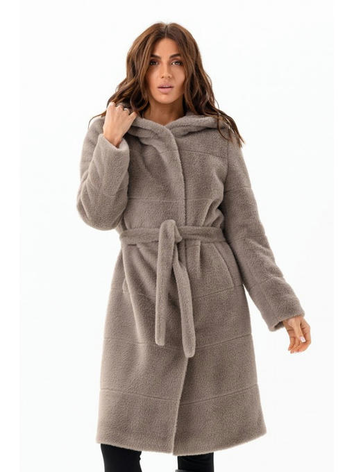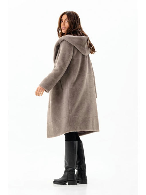 Модель имеет свободный вшитый капюшон. Втачные рукава. Есть прорезные карманы. Удобная застежка металлическими кнопками. По всей шубке проходят горизонтальные строчки, за счет которых шуба из экоальпаки выглядит интереснее. Средняя длина пальто делает его универсальным на любой рост. Модель прямого кроя красиво смотрится с подчеркнутой поясом талией.
