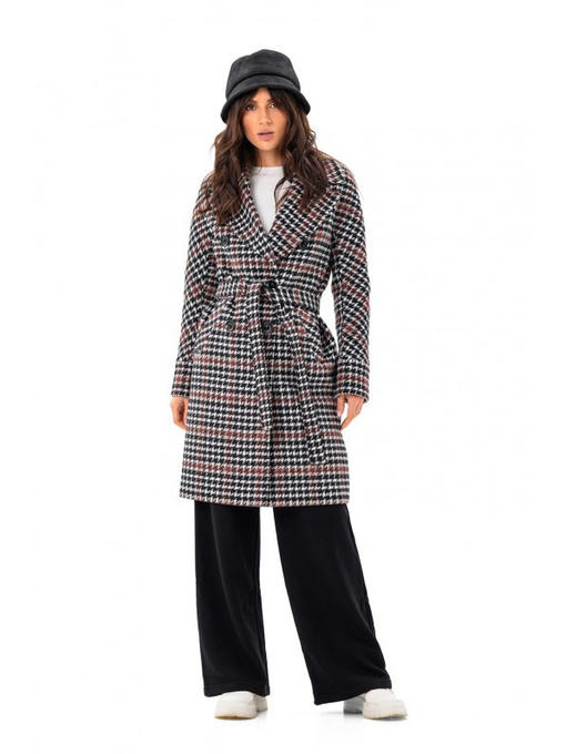 На лицевой стороне внешние пуговицы, под бортом модели скрыты кнопки. Модный широкий отложной воротник с лацканами. Цельнокроеные рукава с манжетом. Два кармана с листочкой. В стильном пальто средней длины предусмотрена шлица. Модель классно смотрится с повязанным на талии поясом.