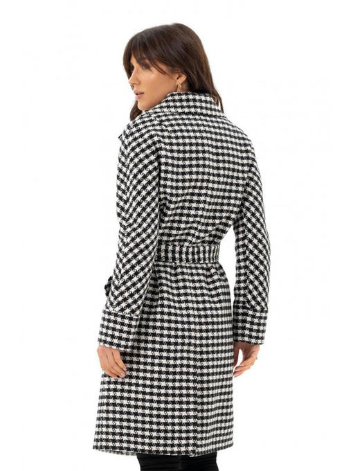 На лицевой стороне внешние пуговицы, под бортом модели скрыты кнопки. Модный широкий отложной воротник с лацканами. Цельнокроеные рукава с манжетом. Два кармана с листочкой. В стильном пальто средней длины предусмотрена шлица. Модель классно смотрится с повязанным на талии поясом.