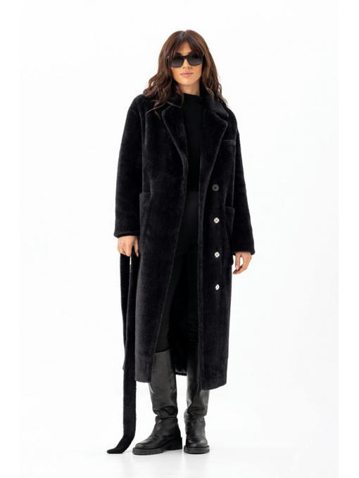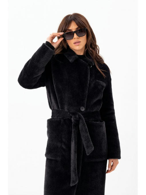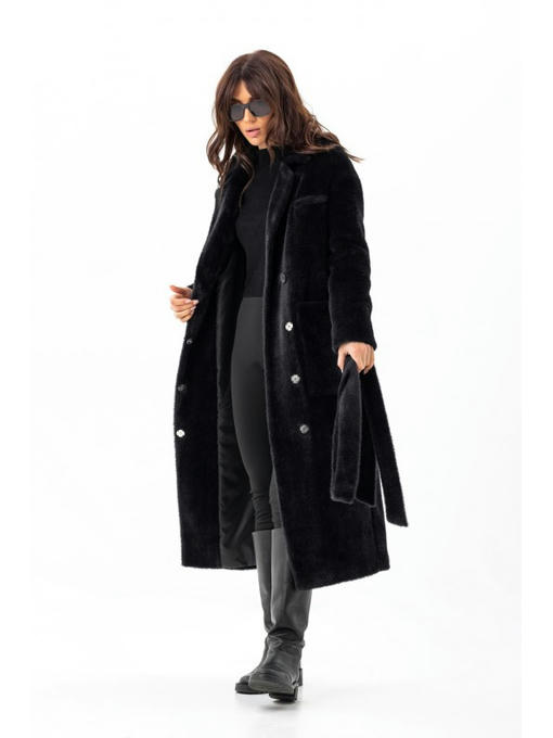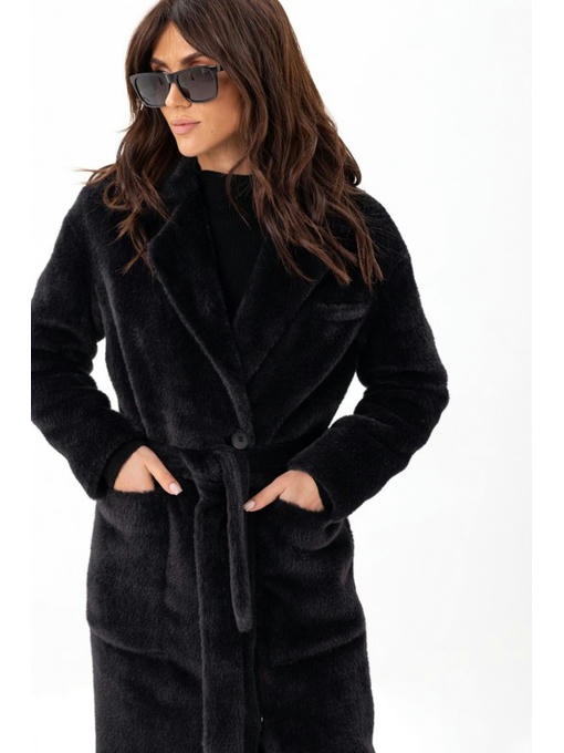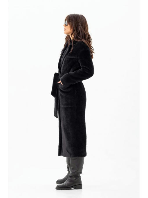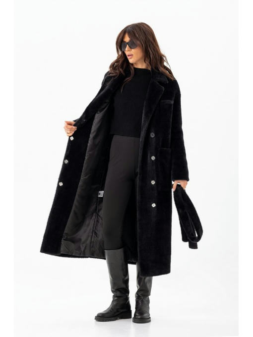 Воротник отложной с лацканом. Под воротником – внешняя пуговица. Длинное пальто застегивается кнопками. Пояс станет ярким акцентом на талии.