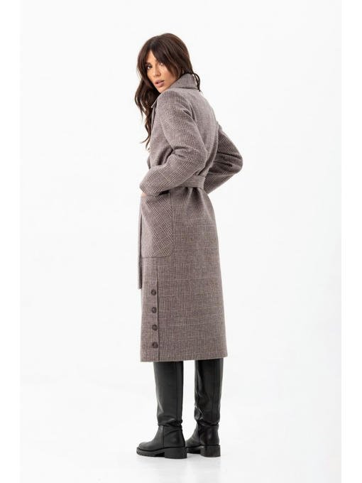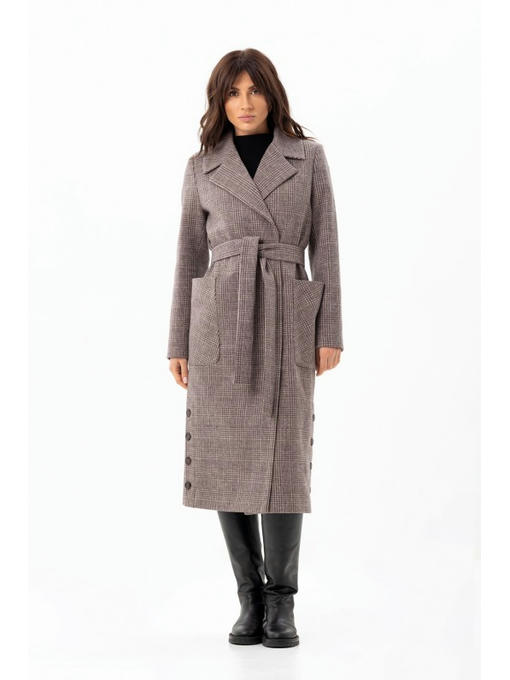 Утепленное пальто в клетку впечатляет интересной дизайнерской задумкой. Прямое женское пальто сшито из эффектной шерстяной ткани в клетку. Утеплитель слимтекс. Отложной воротник. Втачные рукава. Накладные карманы По бокам разрезы на функциональных пуговицах. Застежка кнопками. В комплекте пояс.