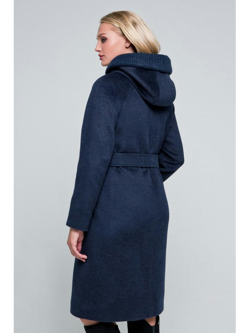 Капюшон – преимущество данного пальто. Для его пошива использована основная ткань и трикотажная вставка с красивой вязкой. Такой головной убор нежно обрамляем голову, препятствуя осадкам и ветру.