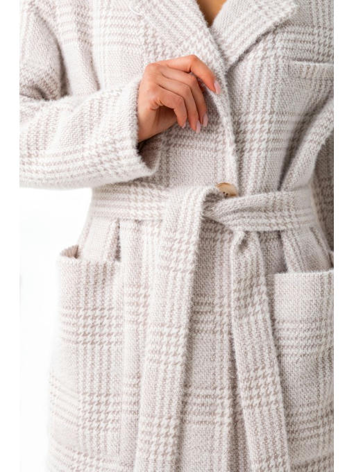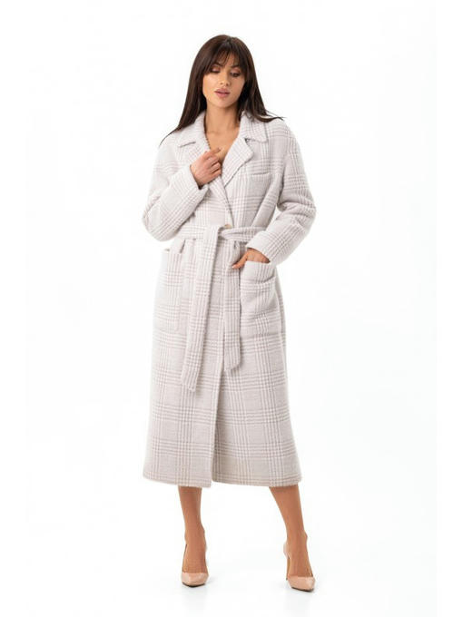 Воротник отложной с лацканом. Под воротником – внешняя пуговица. Длинное пальто застегивается кнопками. Пояс станет ярким акцентом на талии.
