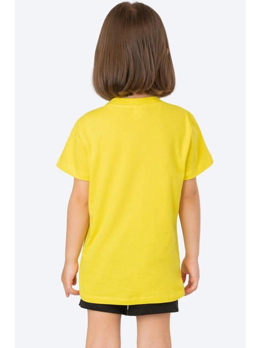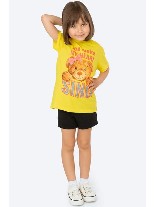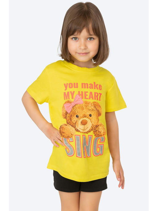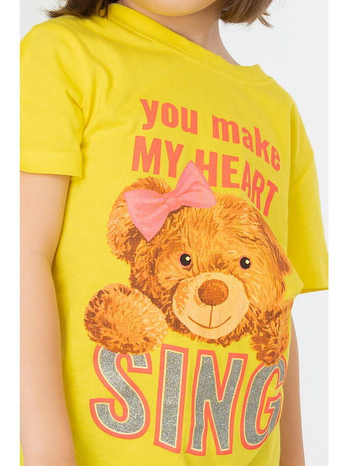 Невероятно приятная к телу футболка для девочек сшита из легкой кулирной глади. Натуральная 100% хлопковая ткань гипоаллергенна, отлично выдерживает частые стирки без потери формы и цвета. Мягкий хлопок позволяет коже дышать. Детская футболка выполнена в лимонном цвете и украшена милым принтом Медвежонок и надписью с блестками.