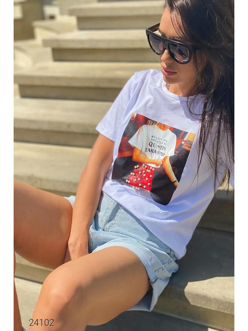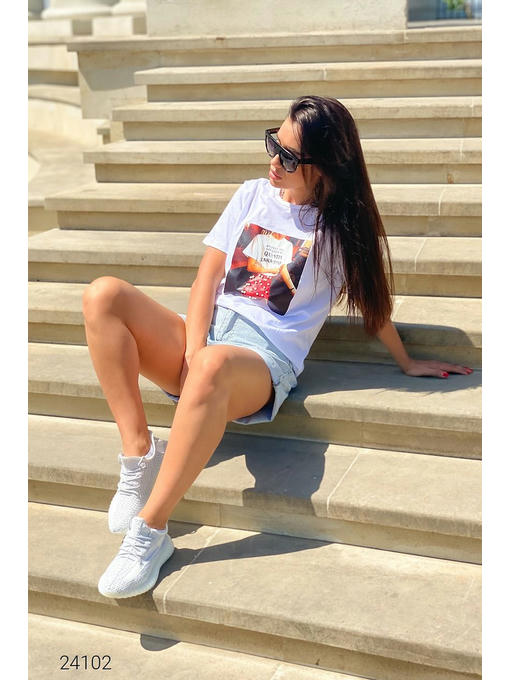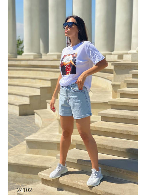 Базовая деталь Вашего гардероба. Круглый вырез, короткие рукава. Состав ткани: 100% – коттон. Незаменимая находка.
