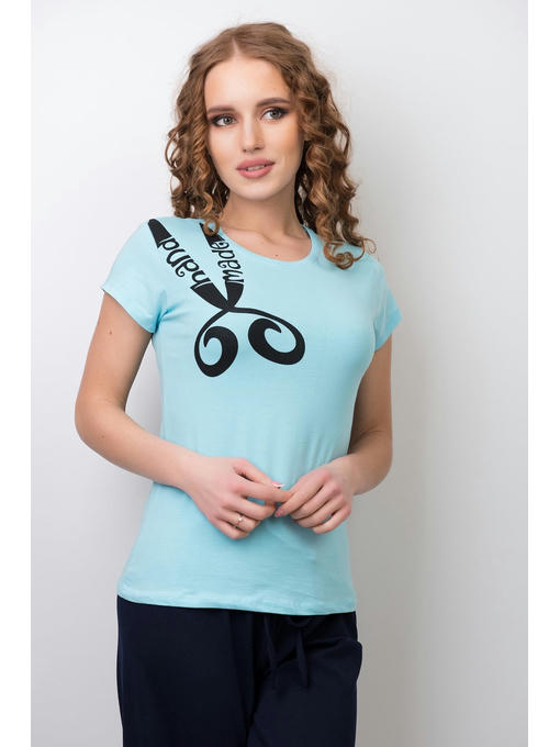Футболка с накаткой ножницы на плече. Имеет прямой крой, круглый вырез горловины и короткий рукав. Параметры модели: рост: 170 см, ОГ: 89 см, ОТ: 60 см, ОБ: 91 см.