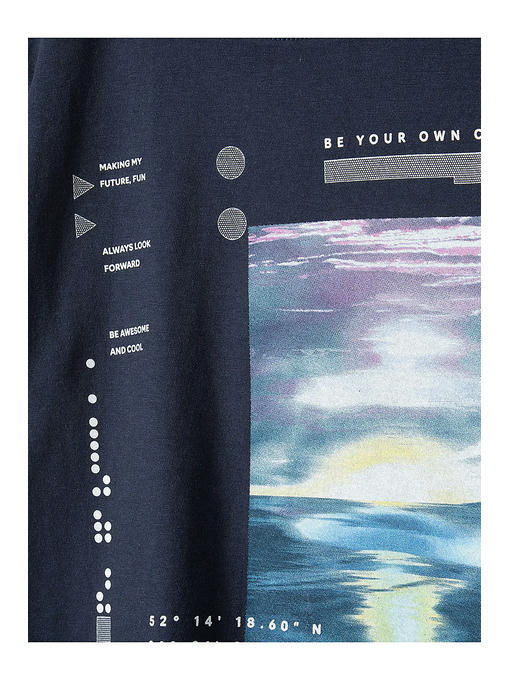 Темно-синяя футболка с принтом для мальчика изготовлена __из высококачественного приятного на ощупь хлопка. Футболка имеет круглый вырез горловины, свободный крой, короткие рукава и украшена дизайнерским принтом. Детская футболка будет отлично смотреться в сочетании со спортивными штанами, джинсами, шортами и брюками карго