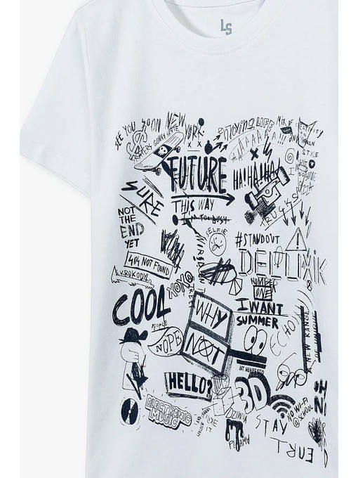 Футболка для мальчика подростка молочного цвета, выполнена из хлопкового трикотажа и приятно прилегает к телу. Украшена текстовым принтом. Стильная и качественная футболка идеально подойдёт для школы и на физкультуру, а также для прогулок с друзьями и путешествий