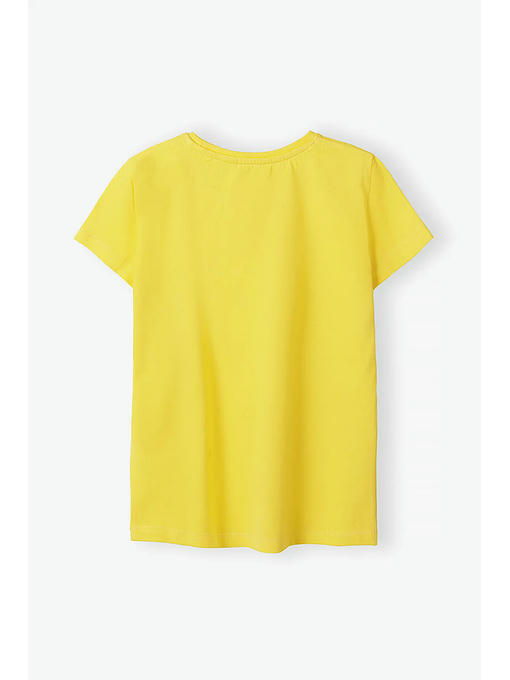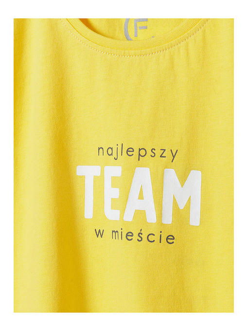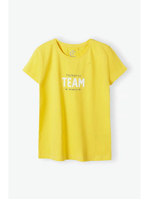 Желтая футболка для девочки изготовлена __из высококачественного приятного на ощупь хлопкового трикотажа. Футболка имеет круглый вырез горловины, прямой крой, короткие рукава и украшена оригинальным принтом в виде надписи «лучшая команда города». Эта детская футболка подойдет к любому весеннему наряду и будет отлично смотреться в сочетании со спортивными штанами, джинсами, шортами, леггинсами и юбками