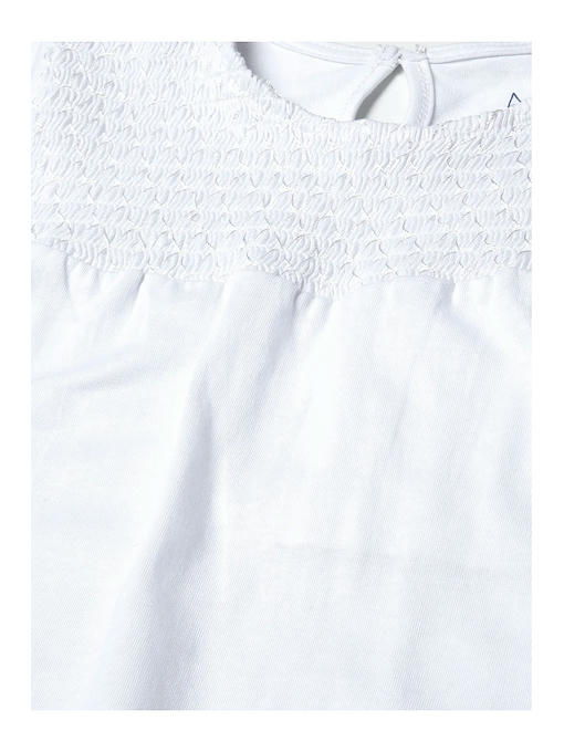 Белая футболка для девочки изготовлена __из высококачественного приятного на ощупь хлопкового трикотажа. Футболка имеет круглый вырез горловины, прямой крой, короткие рукава. Горловина на спине с застежкой на пуговицу. На груди жатый декор. Эта детская футболка подойдет к любому весеннему наряду и будет отлично смотреться в сочетании со спортивными штанами, джинсами, шортами, леггинсами и юбками, а также подойдёт для торжественных случаев