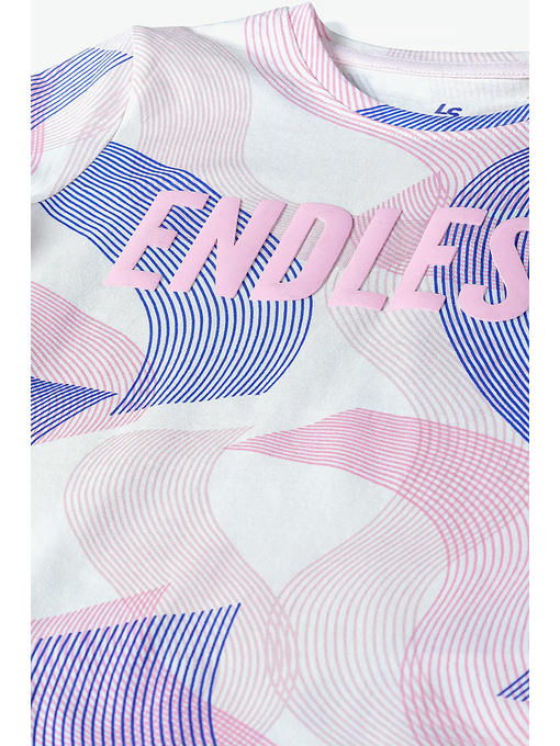 Футболка розово-синего цвета с коротким рукавом для девочки выполнена из хлопкового трикотажа, который прекрасно пропускает воздух и не раздражает кожу ребенка. Футболка отлично подойдёт в школу и на физкультуру, прогулок на свежем воздухе и путешествий. Благодаря стильному текстовому принту, сочетается с джинсами, брюками, спортивными штанами и леггинсами