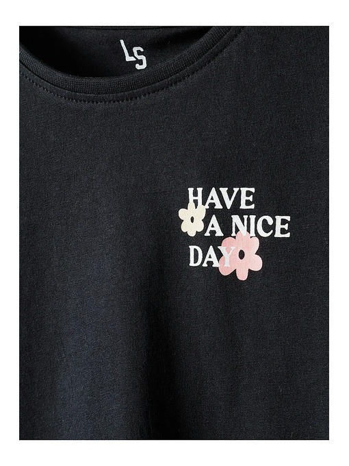 Черная футболка для девочки изготовлена __из высококачественного приятного на ощупь хлопкового трикотажа. Футболка имеет круглый вырез горловины, прямой крой, короткие рукава и украшена принтом в виде цветов и надписью “хорошего дня”. Эта детская футболка подойдет к любому весеннему наряду и будет отлично смотреться в сочетании со спортивными штанами, джинсами, шортами, леггинсами и юбками