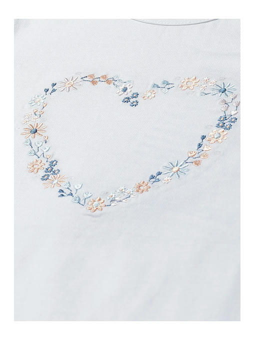 Белая футболка для девочки изготовлена __из высококачественного приятного на ощупь хлопкового трикотажа. Футболка имеет круглый вырез горловины, прямой крой, короткие рукава. Декоративным элементом здесь является вышитое сердечко в розовых и голубых тонах в виде цветов. Эта детская футболка подойдет к любому летнему наряду и будет отлично смотреться в сочетании со спортивными штанами, джинсами, шортами, леггинсами и юбками