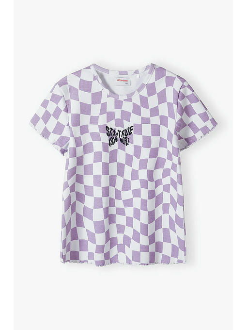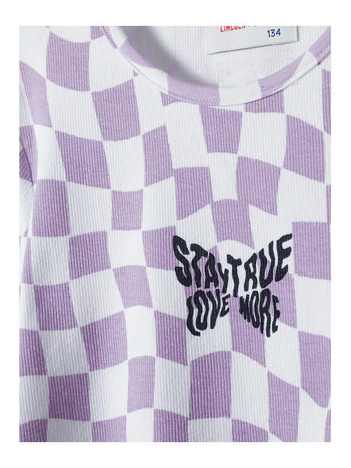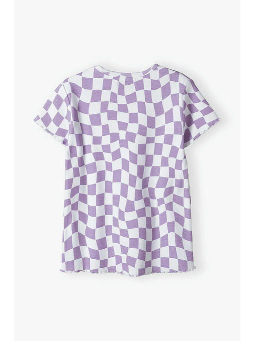 Сиреневая футболка для девочки изготовлена __из высококачественного приятного на ощупь хлопкового трикотажа. Футболка имеет круглый вырез горловины, прямой крой, короткие рукава и украшена интересным принтом. Эта детская футболка подойдет к любому весеннему наряду и будет отлично смотреться в сочетании со спортивными штанами, джинсами, шортами, леггинсами и юбками