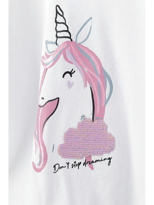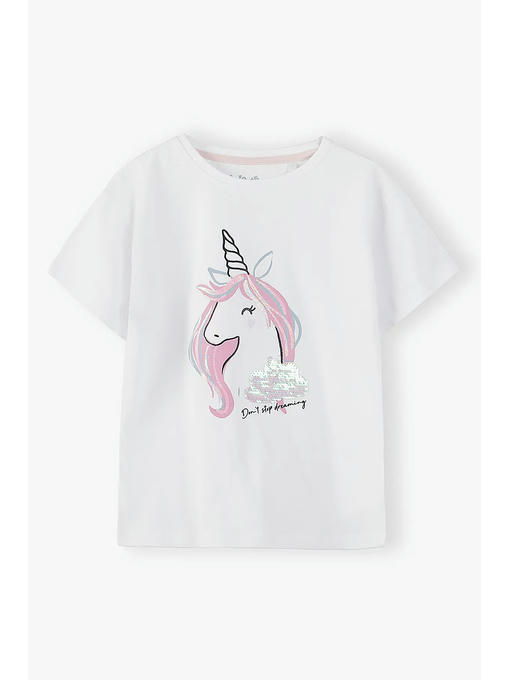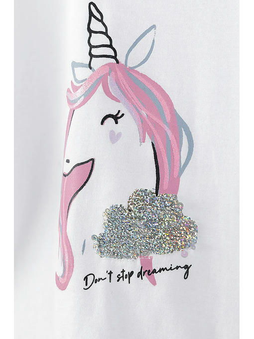 Белая футболка для девочки изготовлена __из высококачественного приятного на ощупь хлопкового трикотажа. Футболка имеет круглый вырез горловины, прямой крой, короткие рукава и украшена аппликацией из пайеток и принтом с блеском в виде единорога. Эта детская футболка подойдет к любому летнему наряду и будет отлично смотреться в сочетании со спортивными штанами, джинсами, шортами, леггинсами и юбками