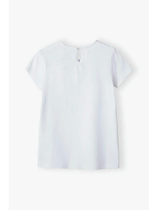Белая футболка для девочки изготовлена __из высококачественного приятного на ощупь хлопкового трикотажа. Футболка имеет круглый вырез горловины, прямой крой, короткие рукава. Горловина на спине с застежкой на пуговицу. На груди жатый декор. Эта детская футболка подойдет к любому весеннему наряду и будет отлично смотреться в сочетании со спортивными штанами, джинсами, шортами, леггинсами и юбками, а также подойдёт для торжественных случаев