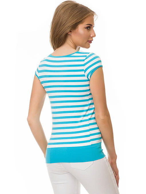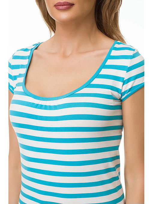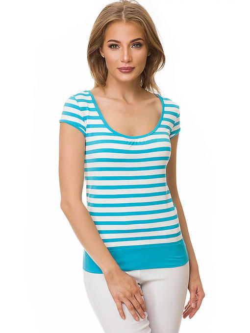 Бесшовная футболка с коротким рукавом и глубоким круглым вырезом, выполненная из мягкой “дышащей” микрофибры с лайкрой. Нижняя часть модели заканчивается широкой эластичной резинкой, рисунок “горизонтальные полоски” спереди и сзади