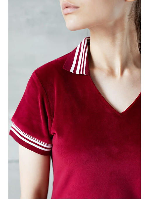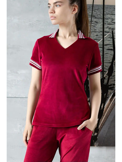 Женская футболка в спортивном стиле, для дома и отдыха. Приятный и мягкий бархатный велюр сочного аппетитного гранатового цвета. Воротничок и манжеты из плотного трикотажа, V- образный вырез горловины, прямой, чуть приталенный силуэт. Хороша как соло с любым подходящим низом, так и в комплекте с брюками P-60 из такой же ткани
