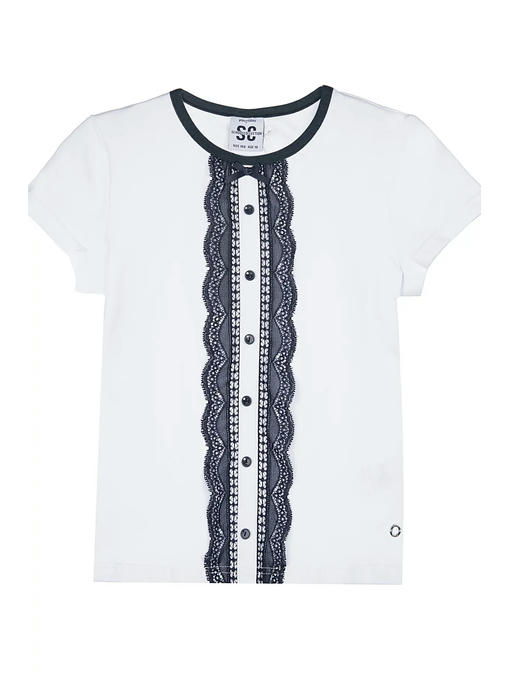 Футболка трикотажная полуприлегающего силуэта. Декорирована кружевом. Высокое содержание хлопка 95%. Благодаря наличию эластана в составе ткани, изделие проще в уходе и держит форму