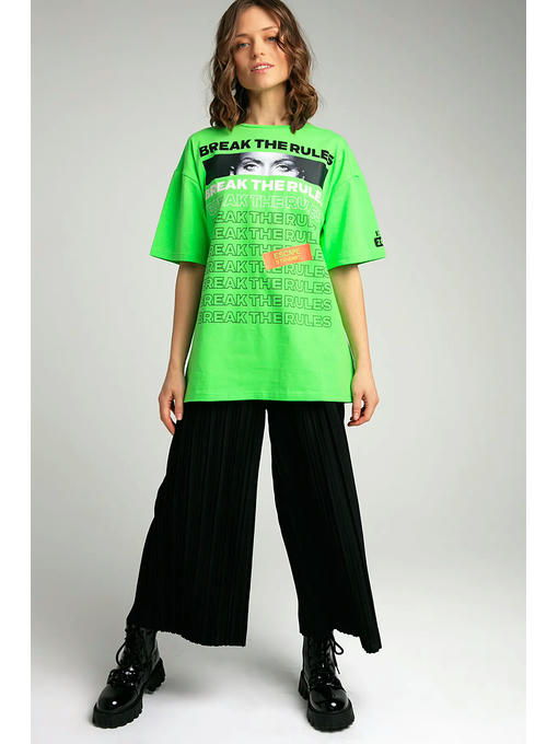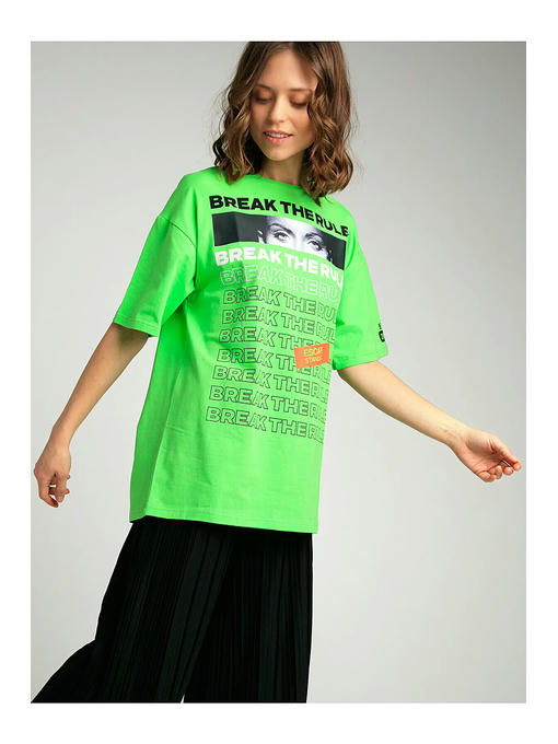 Футболка oversize взрослых размеров из качественного и приятного на ощупь трикотажа джерси. Высокое содержание хлопка 95%. Благодаря наличию эластана в составе ткани изделие проще в уходе и держит форму