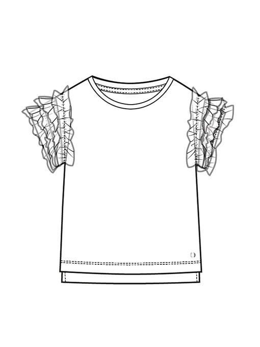 Футболка трикотажная прямого силуэта. Цельнокроенные рукава декорированы рюшами из сетки. Высокое содержание хлопка 95%. Благодаря наличию эластана в составе ткани, изделие проще в уходе и держит форму