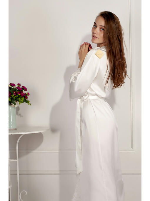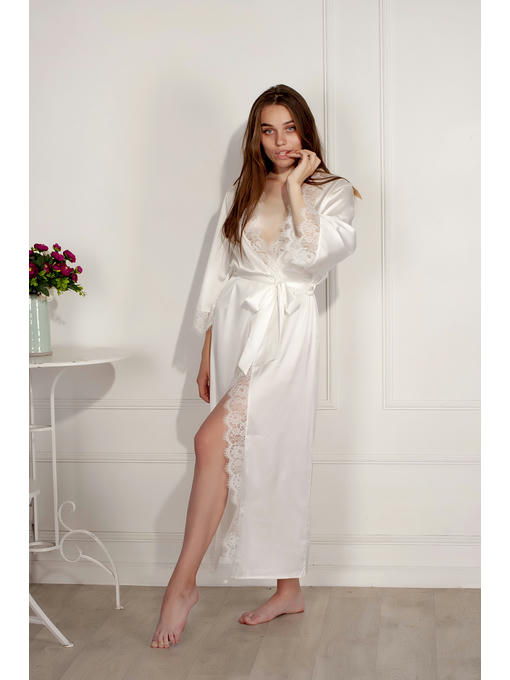 Женский халат из качественного сатин шелка и кружева, в пол, шампаневыйд, под пояс