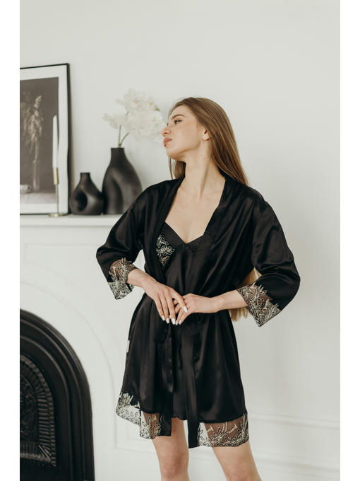 Халат женский из сатин шелка с кружевом, цвет черный. Халат под пояс, без карманов, чуть выше колен. Можно в комплекте с сорочкой.