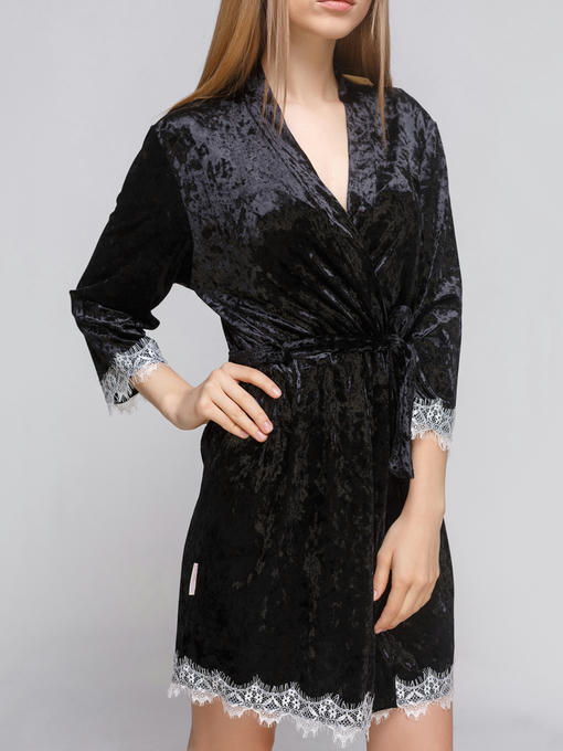 Халат женский из мягкого и качественного велюра с кружевом черный с шампаневым,, завязывается на запах с помощью пояса, рукав /, длина выше колен; красивая комфортная незаменима в домашнем гардеробе; можно подобрать комплектом к халату сорочку и пижамку