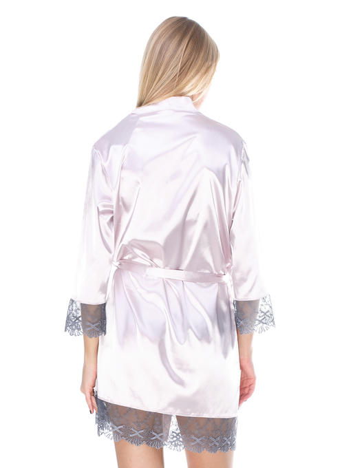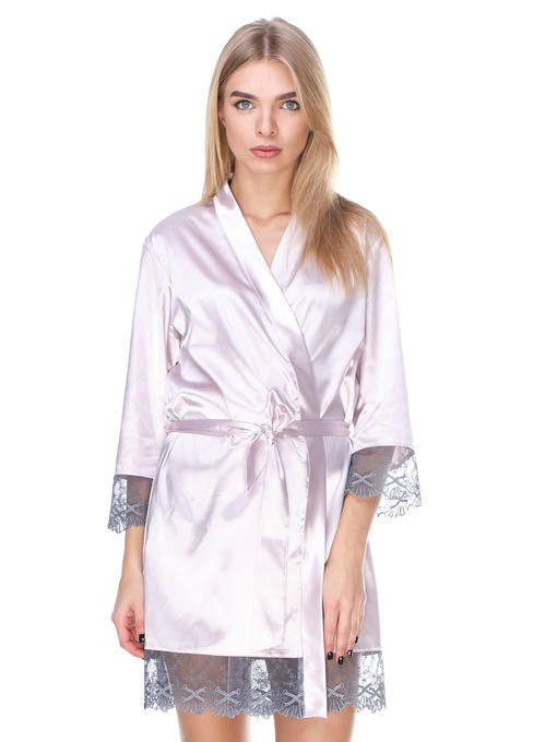 Халат женский из стрейч атласа с кружевом, палевый с серым