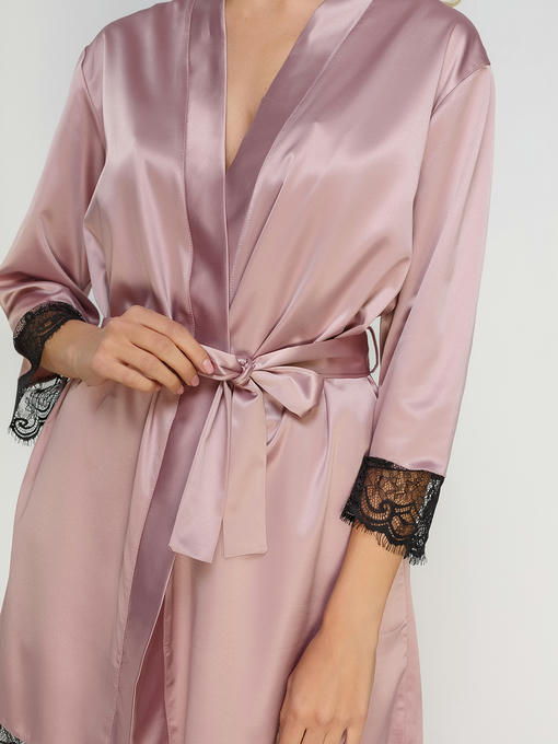 Халат из сатин-шелка с кружевом, сливовый с черным