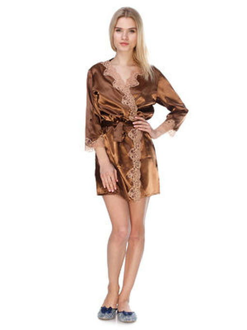 Халат женский из стрейч атласа с кружевом, коричневый с золотом