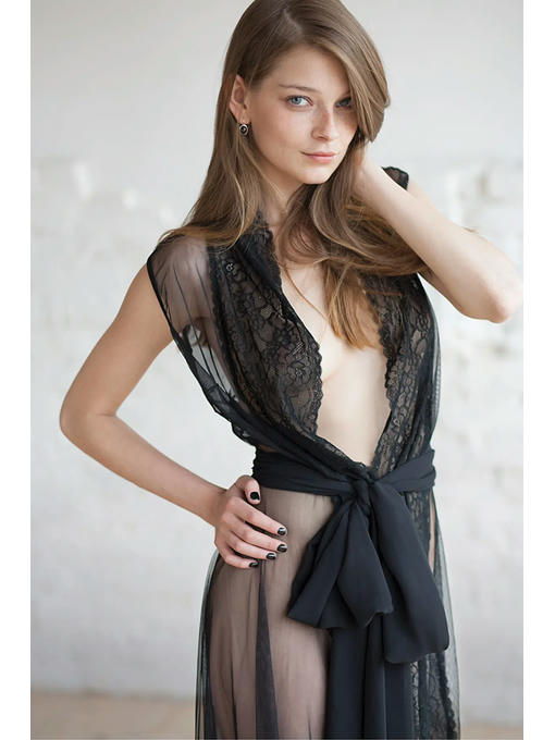Роскошный халат из сетчатой ткани украшен кружевом. Широкий пояс из этой же ткани подхватывает талию. От обнаженного тела, прикрытого полупрозрачной тканью, захватывает дух. Ваш мужчина будет в восторге