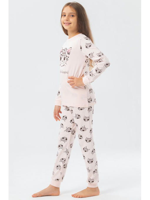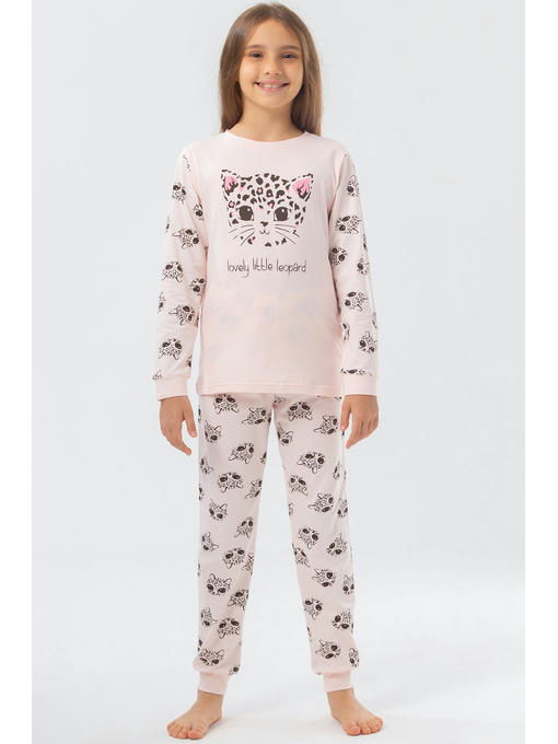Мягкая пижама для девочки сшита из трикотажа кулирная гладь. Приятный на ощупь хлопок с добавлением безопасных синтетических волокон позволяет нежной коже дышать, прекрасно держит форму, не вытягивается, сохраняет цвет даже после многочисленных стирок. Домашний костюм выполнен в нежном пудровом оттенке и украшен милым принтом леопарды.