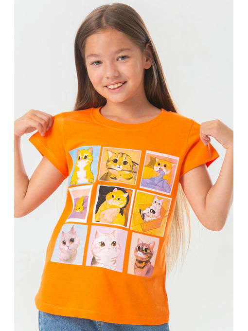 Детская футболка для девочек и подростков выполнена из натурального 100% хлопка, ткань кулирная гладь. Хлопковая футболка из качественного трикотажа выдерживает многочисленные стирки без потери чистоты цвета и четкости рисунка. Оранжевая футболка украшена принтом Котики.