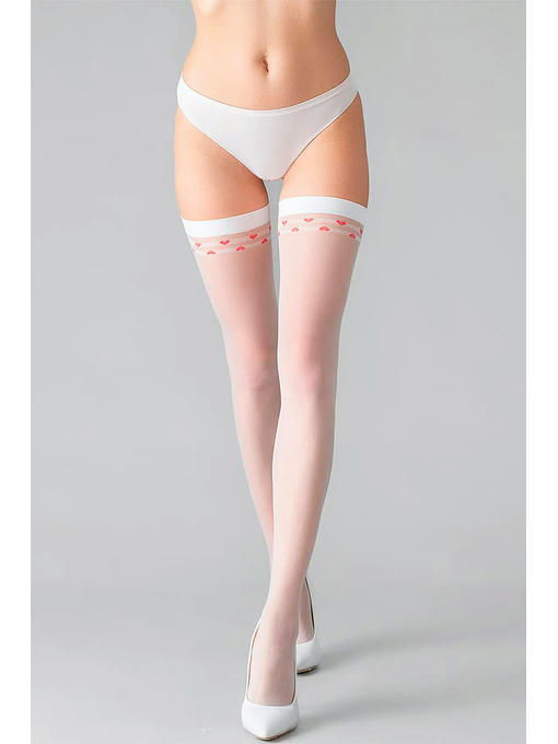Тонкие эластичные чулки “под пояс” с широкой гладкой каймой для крепления застежек, декорированной ярким тканым узором “сердечки и полоски”. У модели невидимый укрепленный мысок и формованная ступня. Пояс в комплект не входит