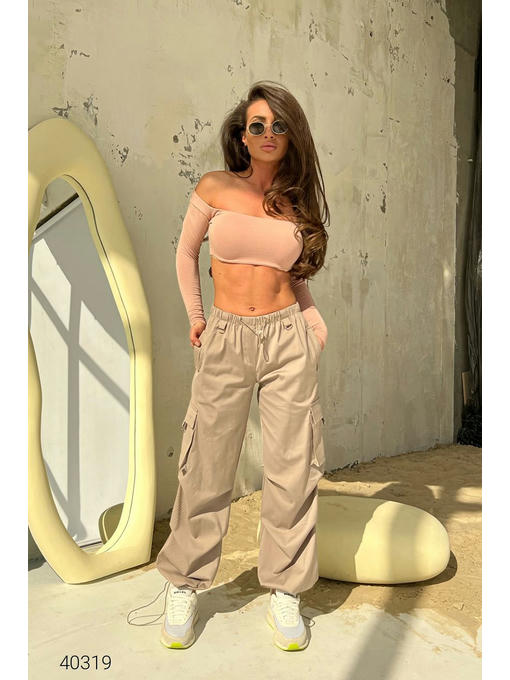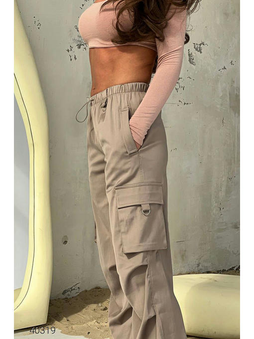 Штаны карго женские. Свободные штаны, средняя посадка с широким эластичным поясом, дополненные накладными карманами и регулируемыми резинками на манжетах.