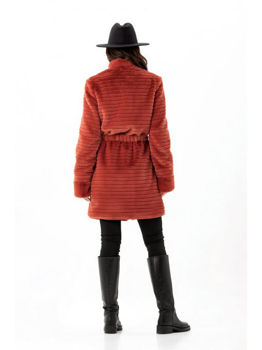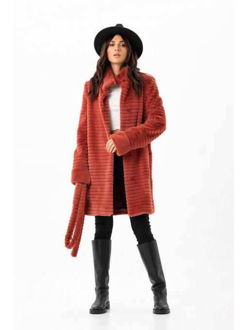 Эффектный вид обеспечен аккуратными выстриженными линиями. Манжеты и воротник-стойка сделаны из нестриженого материала. Втачной рукав. Карманы прорезные. Длинный пояс в комплекте. Длина шубки выше колен.